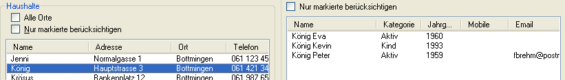 "Nur markierte"Falls Ihnen die oben beschriebenen Filter zu allgemein sind, können Sie die Hauptregel, dass Aktionen auf alle sichtbaren Personen / Haushalte angewendet werden mit der Funktion "Nur markierte berücksichtigen" ändern. Wenn Sie diese Checkbox aktivieren wird die Liste so geändert, dass sie